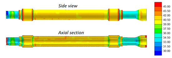 Wall thickness (given in mm) in a 3-roll skew rolled hollow axle after calibration.