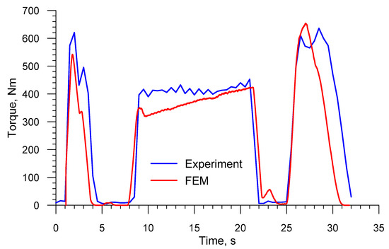 Figure 28 shows the comparison of the FEM and experimental torques that are qualitatively very similar to the FEM and experimental radial loads. The mean experimental torque is 301.19 Nm and is higher than the mean torque from the numerical analysis, which amounted to 270.74 Nm. The values differ by 10.1%. Finally, considering the agreement between the experimental and numerical radial loads and torques, it can be claimed that the developed numerical model of a skew-rolling process for a railway axle properly reflects the real forming conditions.