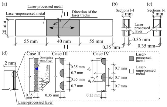 The dimension of the laser-processed surface area in all cases was 40 mm × 20 mm. Four different laser-processing cases were adopted that differed in the number of laser tracks. In case I, no laser tracks were made at all, i.e., the metal plate was left unprocessed. In case II, 38 laser tracks were made, with the tracks overlapping in approximately 30% of their width. In case III, 17 laser tracks were made, with a distance between the tracks approximately equal to 50% of their widths. In case IV, 14 laser tracks were made, with a distance between the tracks equal to the track width.