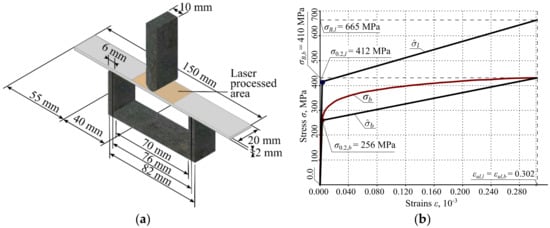 As can be seen from Figure 3b, the curve does not exhibit a clear yield plateau. After reaching the yield strength, so-called work hardening is specific to the base metal. Due to the difficulty of experimental investigation of the mechanical properties of the laser-processed metal, the curve of this metal is unknown. Only indirect estimations of the yield strength, MPa, and the ultimate strength, MPa, were obtained, using the J. R. Cahoon equations, [,], which establish the relations between the hardness and strength of metals. However, the ultimate strains, of the laser-processed metal are still unknown. Therefore, it is assumed that the ultimate strains of the laser-processed metal are the same as for the laser-unprocessed metal, i.e., it is assumed that .
