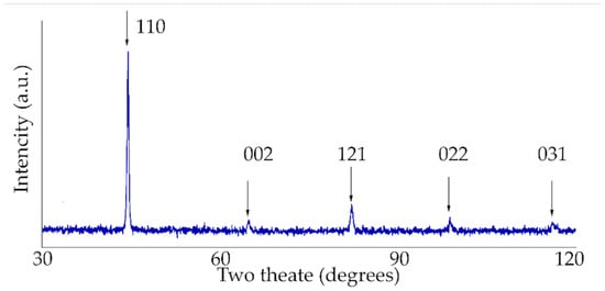 The thickness of the laser-processed layer, which is established by metallographic examination of cross-sections of samples of metal processed by laser, was about 0.35 mm (see Figure 4). There are no unacceptable inclusions, porosity or internal defects in the remelted area and transition area. The microstructure of the base metal consists of 70% ferrite and 30% pearlite (see Figure 5a), according to GOST 8233 []. Granularity in the processed zone decreases from G8 (average grain diameter about 18 µm) to G10 (average grain diameter about 10 µm), according to ISO 643 []. According to the XRD data analysis (see Figure 6), the X-ray diffraction pattern of the laser-processed layer is typical for the ferrite microstructure family (including sorbite and troostite) with BCC crystal structure). The same crystal structure has martensite and bainite. The Fe3C peak and other carbide peaks were not observed. This is typical, so carbon content in the steel is low or peak sensitivity is below the limit of detection sensitivity. Therefore, XRD analysis confirms only that there is no unstable, retained austenite in the laser-processed area, because the austenite has the FCC crystal structure and other XRD diffraction peaks. In low-carbon steel, high-retained austenite contents are usually found together with the martensite or bainite phase in the quenched steel after cooling. The measurement of microhardness shows that the hardness of the laser-processed layer increases up to 200 HV (by 60%) compared to the laser-unprocessed base metal hardness (see Figure 7). According to the hardness measurement results, there are no hard and brittle bainite and martensite microstructures in the laser-processed areas or their proportion is very low, because such quenching microstructures have the highest hardness: bainite—about 400 HV and martensite—above 450 HV [,]. Consequently, to achieve a hardness of about 200 HV, it is necessary to have a minimum of about 25% of bainite or martensite structure in the present low-carbon steel after rapid cooling of the microstructure of the melted area, or the steel’s microstructure must be strengthened by refining the grain size and creating a finely dispersed perlite (sorbite, troostite) structure.