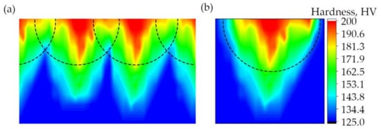 Distribution of hardness through the cross-section of the laser-processed surface of sample IIA: (a) and (b) show the distributions of three- and one-laser-processed tracks respectively.