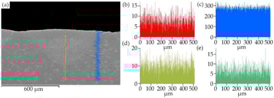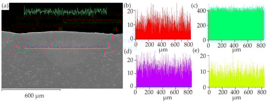 Line scan element analysis along the surface of laser-processed layer: (a) place of line scan in cross-section of layer; (b) C distribution; (c) Fe distribution; (d) Si distribution; (e) Mn distribution.