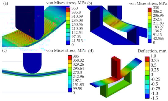 The bending of the thin metal plate was modeled by finite element analysis (FEA), using the Ansys workbench software package, version 16.0. A numerical model of the bending test was created identical to the experimental bend test device; see sub-chapter 3.2. The general view of the numerical model is shown in Figure 3a. The geometry and dimensions of the FEA models of the plate were identical to the plates used in the experimental investigation; see Figure 1. The shape and depth of the laser-processed metal (0.35 mm) were identical for all FEA models of the plates (see Figure 3 and Table 6). The distance between supports (76 mm), punch width (10 mm) and fixation conditions in the FEA simulation were the same as those used during the real experiments. The plates in FEA modeling were supported simply, as it is shown in Figure 2b. For all three variants, the load was imposed in the middle of the span of the stand; see Figure 3a. The laser processing cases and loading variants used in the present FEA are summarized in Table 6. As in the case of experimental investigation in the numerical modeling in general, 10 different simulations were conducted; see Table 6.