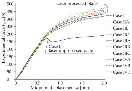 In the case of bending the one-side laser-processed plate, the laser-processed layer may be under tension or under compression. To evaluate the influence of the stress-strain state of the laser-processed layer on the deflections or the bending stiffness of the plate, 3 different loading variants were considered. In Variant A, the bending load was imposed on the laser-processed side of the one-side laser-processed plate, so that the laser-processed layer was under compression. In Variant B, was imposed on the laser-unprocessed side of the one-side laser-processed plate, so that the laser-processed layer was under tension. In Variant C, was imposed on the two-side laser-processed plate. In this case, the top laser-processed layer was under compression, while the bottom laser-processed layer was under tension. Also, 4 already mentioned laser-processing cases were considered with each loading variant: case I, laser-unprocessed plate; case II, 38 laser tracks; case III, 17 laser tracks; and finally, case IV, 14 laser tracks. In total, 10 different force–deflection experiment cases were conducted. These cases are summarized in Table 5. In general, three measurements were performed to determine each quantity. Three plates were tested for case I, and 9 plates for the rest of the laser-processed plate cases: case II–case IV. Thus, in general, 39 plates were tested for the bending experiment. The estimated mean values are presented and analyses hereafter are in the present article.