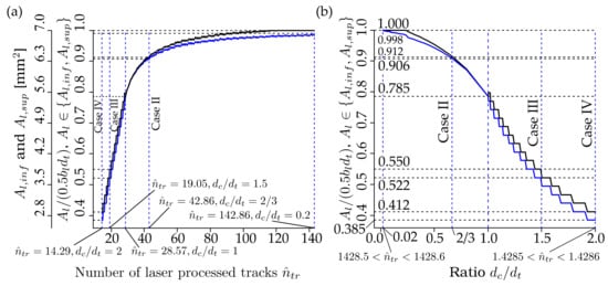 Figure 13 shows the dependency of the ratio of the area of the remelted metal to the supremum bound of the area of the laser-processed metal (Figure 13a), and the dependency of the ratio of the overlapping area on the cross-sectional area of the single laser-processed track on the ratio of the plate under consideration; see Figure 1, where the total area of the remelted metal is calculated as follows: .