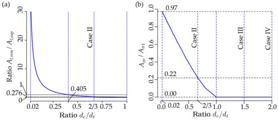 The dependencies of the ratios and on the ratio of the considered plate, see Figure 1: (a) versus ; and (b) versus .