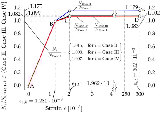As we can see from Figure 14, the influence of laser processing is almost infinitesimal when ; see section AB in Figure 14. The maximum ratio, . If the axial stiffness of the cross-section of the plate is , then we can say that laser processing does not have any influence on the axial stiffness of the plate when . However, the influence of laser processing on the ratio of the axial forces increases with increasing strain within the interval and remains constant when , where hereafter ; see sections BC and CD in Figure 13.