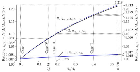 The dependencies of the ratios of the axial forces at with respect to the ratio of the cross-sectional areas of the laser-processed and base metals of the plate shown in Figure 1 are shown in Figure 15. In the situation when , since also corresponds to the laser-unprocessed plate, i.e., case I, then . In these calculations, it was assumed that the cross-sectional area of the laser-processed metal attains values from the interval: . Since , where , then . Thus, corresponds to the upper bound of the cross-sectional area of the laser-processed metal when of the two-side laser-processed plate; see Figure 1b. Other parameters used to draw Figure 15 were the same as in Figure 14; see the explanations given at the beginning of the present subchapter.