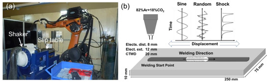 The welding experiments were conducted using a robotic TP-GMAW facility at IIT Hyderabad (Sangareddy, India). The two electrode wires were fed simultaneously through the welding torch and received electric power from two independent power sources, as shown in Figure 1a. The two power sources were synchronized in an anti-phase manner to limit the arc interaction. The robotic welding facility consists of a 6-axis robot (KR 30-3) made by KUKA (Augsburg, Germany), attached to a time-twin digital welding machine from Fronius. The robot had a reach of 2033 mm and a repeatability of +0.06 mm. An electro-dynamic vibration shaker (Sdyn, Roorkee, India) of 1500 kgf capacity was used to generate vibration. The slip table connected to the shaker head was vibrated longitudinally. The fixture was bolted to the slip table with sheets of the insulator and thermal barrier in between. Four wedge clamps were used evenly to fix the workpiece tightly to avoid any kind of distortion during welding. The insulator prevented the flow of current through the slip table and shaker head and thus avoided possible danger to the shaker.