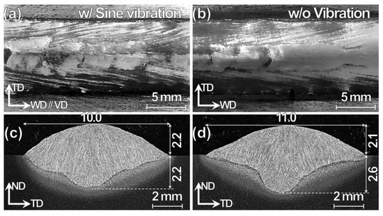 (a,b) Top-view and (c,d) cross-sectional optical microscopy (OM) images for Tandem-pulsed gas metal arc welding (TP-GMAW) specimens at 1.2 m/min (a,c) w/ and (b,d) w/o sine vibration (vibration frequency (F) = 250 Hz, vibration acceleration peak (G) = 1.2 m/s2 and time of vibration after welding ends (T) = 30 s).