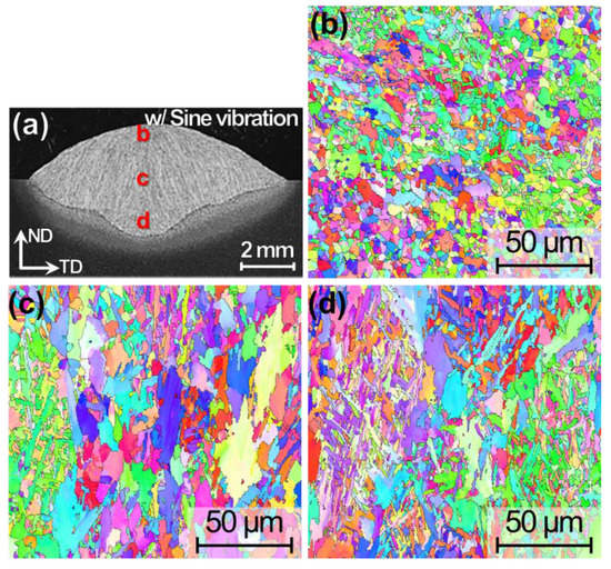 Cross-sectional (a) OM image and (b–d) electron back-scatter diffraction-inverse pole figure (EBSD-IPF) maps for TP-GMAW specimens at 1.2 m/min w/ sine vibration (F = 250 Hz, G = 1.2 m/s2 and T = 30 s).