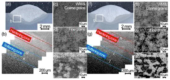 The HAZ included coarse grains, mixed grains, fine grains, and spherical pearlite from the boundary between WM and HAZ to BM in order as shown in Figure 4. Cross-sectional scanning electron microscope (SEM) images for TP-GMAW specimens at 1.2 mm/min w/ vibration are shown in Figure 4a–e. The macroscopic SEM image below the concave spot exhibits indistinct gray contrast and white spotted images in order, and the spots grow in a direction away from the boundary between WM and HAZ (Figure 4b). The enlarged images in the positions designated by c, d, and e in Figure 4b are shown in Figure 4c,d,e, respectively. The coarse- and fine-grain zones indicate lath martensite (Figure 4c) and fine ferrite and bainite grains (Figure 4d). The bainite grains exhibit white needle like contrast. Further away from the boundary, cementite with white contrast gathered in a spherical manner, forming spherical pearlite (Figure 4e). The similar microstructure feature was also observed below the WM bottom with less HAZ thickness. Similar macroscopic and microscopic feature also exhibits in HAZ of specimens w/o vibration as shown in Figure 4f–j. Thus, the sine-mode workpiece vibration does change penetration shape, but does not change WM and HAZ macroscopic and microscopic features although HAZ thickness depends on the penetration shape.