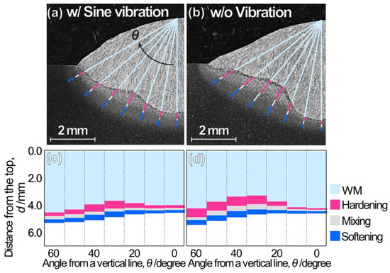 The sine vibration changes the penetration shape, leading to a change of HAZ thickness distribution below the fusion lines. The HAZ-thickness distribution is shown in Figure 5. The line segments of WM and HAZ including hardening, mixing, and softening areas are drawn on the cross-sectional OM images from the top of WM to the end of the HAZ, clockwise at 10° interval from 0° to 60° (Figure 5a,b). The segment length is displayed by a bar chart in Figure 5c,d. The length of a hardening-area bar reduces for the specimen w/ vibration (Figure 5c) in comparison to that for the specimen w/o vibration (Figure 5d). The length difference between mixing and softening areas is not quite obvious. The WM concave spot reduces for the specimen w/ vibration. The total length of WM and HAZ, with an increase in angle, reduces for the specimens.