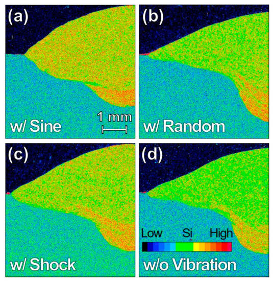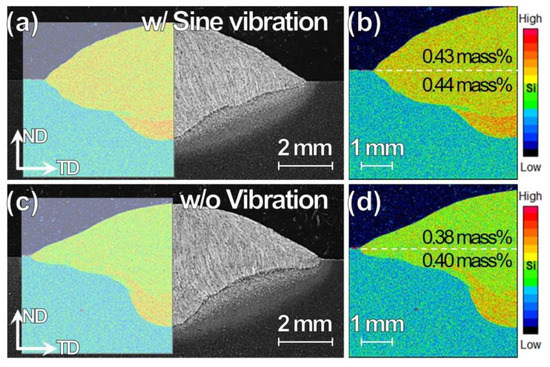 The sine vibration could affect the molten material flow, and thus the WM dilution is investigated by EPMA-Si mapping where Si is considered as a probe. The Si content is higher in the filler wire than in the BM. The EPMA-Si mapping is conducted in the area, as shown in the inset figure on the cross-sectional OM images in Figure 7a,c and the enlarged mappings are shown in Figure 7b,d for the specimens w/ and w/o vibration, respectively.