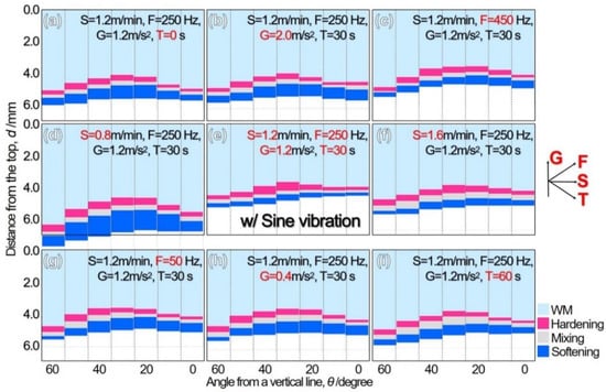 The line segments of WM and HAZ including hardening, mixing, and softening areas are displayed for the welding parameter (S) and sine-vibration parameters (F, G, and T) by a bar chart in Figure 8. The length of a hardening-area bar, as shown in red, is short for almost all the specimens, suggesting that the WM concave spot is reduced by the sine vibration. In contrast, the length of a softening-area bar varies with the parameters. The length increases for the specimen with S of 0.8 m/min (Figure 8d) since the slower welding speed increases heat input that also leads to an increase of total HAZ length. Increasing the heat input also increases molten pool volume, leading to deviation from a specific ratio of droplet size to the molten pool size that is related to the resonance phenomenon. With an increase in the welding speed to 1.6 m/min (Figure 8f), the length of a softening-area bar and a total bar do not increase in comparison to the specimen at 1.2 m/min (Figure 8e). In contrast, the minimum length is for the specimen at F of 250 Hz, G of 1.2 m/s2, and T of 30 s (Figure 8e) with respect to F (Figure 8g,e,c), G (Figure 8h,e,b) and T (Figure 8a,e,i). Consequently, there is a specific sine-vibration condition that reduces the length of a softening-area bar. The obvious trend change could not be seen in the total HAZ length variation with angle for the specimen at 1.2 m/min.