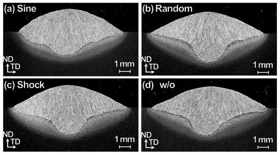Cross-sectional OM images for TP-GMAW specimens at 1.2 m/min w/ three-mode vibration modes including (a) sine, (b) random, and (c) shock modes (F = 250 Hz, G = 1.2 m/s2 and T = 30 s), together with that of (d) w/o vibration, for comparison.