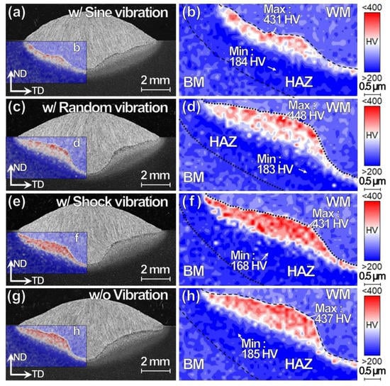 The penetration shape, HAZ thickness, and hardness variation of the specimen w/ shock and random vibration (Figure 11c–f) remain same as w/o vibration (Figure 11g,h), in contrast to the specimen w/ sine vibration (Figure 11a,b). The hardness variation in the HAZ is attributed to the penetration shape and corresponding HAZ thickness variation. The area with relatively higher hardness, as shown in red in the hardening area, decreases in the random mode (Figure 11d) and increases in the shock mode (Figure 11d), while the maximum values remain similar, in comparison to the specimen w/o vibration. The interrupted random vibration does not provide heat flow favorable for the reduction in the HAZ width, but the reason has not yet been clarified.