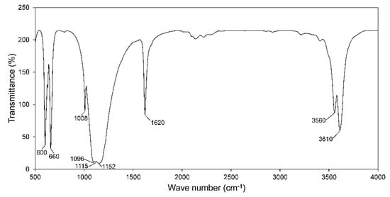 The Fourier transform infrared (FTIR) (Figure 1) shows absorbances of crystalline components in the synthesized powder. The principal peaks corresponding to hemihydrate represented at 660 cm−1 for bending vibrations of SO42− ion, 3560 and 3610 cm−1 for O–H valence (stretching), and 1620 cm−1 for bending vibrations of a single type of water in molecular structure [28,29]. The other peaks denoted vibrations of sulfate ion including 600 cm−1 (bending), 1008 cm−1 (stretching), 1096 cm−1 (stretching), 1115 cm−1 (stretching), and 1152 cm−1 (stretching). There was no presence of foreign functional groups in crystals which showed that acetone in the washing step was effectively removed.