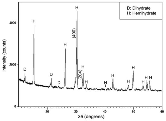 The XRD pattern (Figure 2) further confirms the formation of calcium sulfate phases by their typical peaks. Most peaks were indexed corresponding to standard HH (ICDD 41-0224). Three peaks corresponding to standard DH (ICDD 33-0311) were also detected at a low signal. The results revealed that HH was almost the only mineral in the synthesized powder, but there were still traces of DH. The XRD was still unable to verify whether the hemihydrate belonged to α-form or β-form. Nevertheless, Surajit M. et al. pointed out from the standard patterns of CS phases that β-HH would have broad and low intensity diffraction peaks [30]. Additionally, the peak of α-HH at (204) plane would be remarkably lower than (400) plane. The present synthesis using an autoclave resulted in the formation of highly crystalline crystals as opposed to β-HH and crystal planes compatible with α-HH. Consequently, the synthesized calcium sulfate hemihydrate was expected to be in α-form.