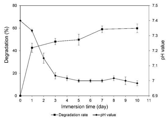 The weight calculation for degradation rate and pH measurement of CS cements are presented in Figure 7. It was found that the weight loss of the cements increased over time. The degradation process occurred vigorously when CS first came into contact with the solution, and then, tended to progress gently and reached the rate of 59.89% at the end of the testing period. The pH value of SBF solution dropped sharply within three days (from 7.4 to 7.0), and was maintained after soaking for 10 days.