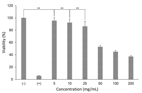 Viability of 3T3 cells after incubation with different CS crystal concentrations: 5, 10, 25, 50, 100, and 200 mg/mL, (−) negative control and (+) positive control. Error bars represent mean ± SD. Statistically significant difference each other (* p < 0.05; ** p < 0.01)
