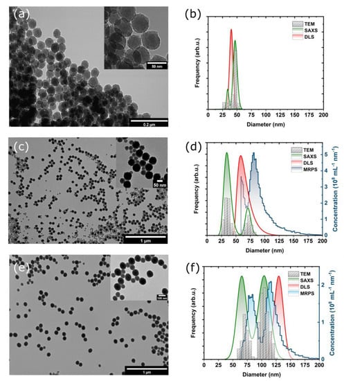 In this work, we investigated the capabilities of various methods for the determination of the PSD of inherently bimodal SNPs. Figure 1 shows the TEM images as well as the PSDs of the three bimodal SNP samples as determined by TEM, DLS, MRPS and SAXS.