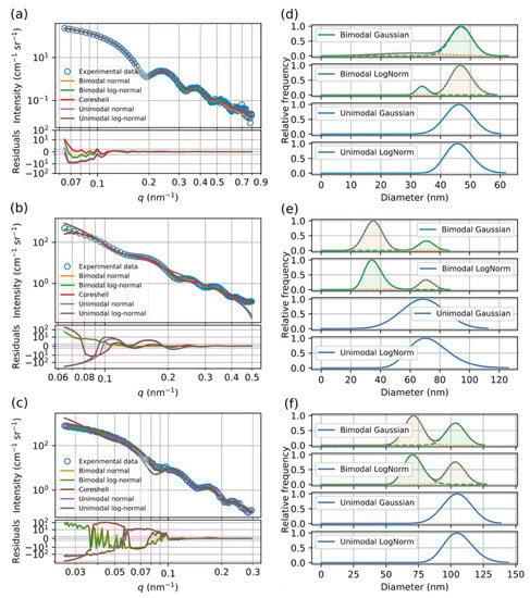 The fourth method for the characterization of the PSDs of the bimodal SNPs was SAXS, which is an ensemble method, but its applicability to determine the PSD of the mixture of two sufficiently monodisperse particles was already demonstrated [31]. In SAXS, the scattered intensity is measured as a function of the momentum transfer, q, which is directly related to the scattering angle. Structural parameters of the scattering objects, e.g., the PSD of the particles in our case, can be obtained by model fitting procedures as described in Section 2.2.4. The measured scattering curves of the investigated samples together with the best fitting curves of various models are shown in Figure 2a–c. The used model functions include unimodal and bimodal distributions using normal and log-normal functions for the different size fractions. An additional core-shell model was also tested, as it can account for the possible structural differences within the particles created by the two-step growth process used for the preparation of M015 and M0171 samples. All parameters corresponding to the best fitting model functions are summarized in Table S2.
