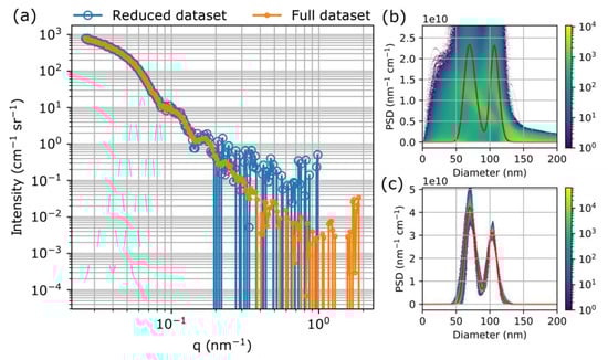 (a) Scattering curves of the SNP022 sample measured at a reduced and an extended (full) q-range and (b,c) the corresponding particle size distributions (PSDs) together with the heat map of possible PSDs calculated by taking the uncertainty and covariance of fitted parameters into account.