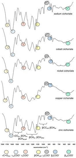 In the IR and Raman spectra of cichoric acid there were many bands that originate from vibrations of the caffeic and tartaric acid moieties. In the IR spectrum of the acid the bands at 1746 and 1716 cm−1 were interpreted as vibrations of the carboxyl group of the tartaric acid moiety. In the IR spectra of metal complexes these bands disappeared what indicates that the metal is bond to the cichoric acid through the carboxylate group of the tartaric acid. In the spectra of the complexes characteristic wide bands originating from vibrations of the carboxylate anion appeared. These are, among others, the bands derived from the stretching vibrations of the symmetric carboxylate anion νsymCOO (1385 cm−1–1384 cm−1) and stretching asymmetric vibrations νasCOO: (1630 cm−1–1605 cm−1) (Table 1, Figure 1). Moreover in the spectra of complexes bands assigned to the symmetric bending in-plane (βsCOO) occurred (868 cm−1–851 cm−1) and asymmetric bending βasCOO (521 cm−1–520 cm−1) (Table 1).