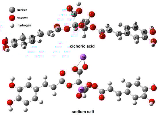 Figure 3. The structure of cichoric acid and sodium cichorate calculated in HF/6-311++G(d,p).
