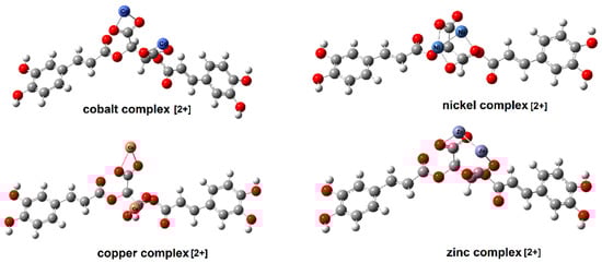 Figure 4. The structure of cation complexes (2+) cobalt, nickel, copper and zinc with cichoric acid calculated in HF/6-311++G(d,p).