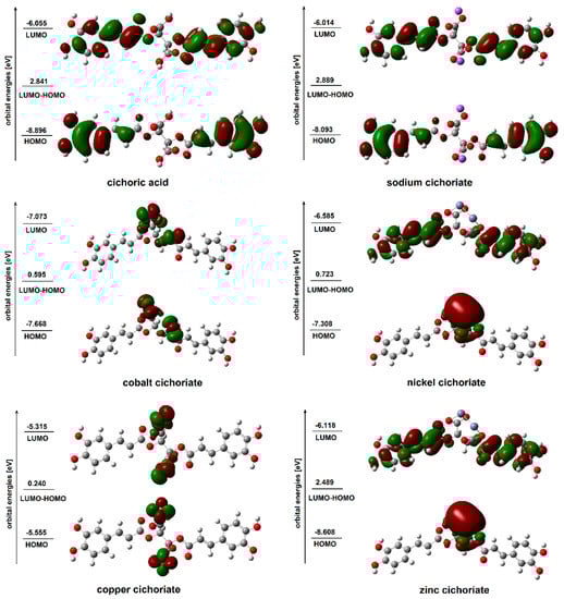The difference in the energy of HOMO and LUMO (ΔE) orbitals was greater for sodium salt, whereas ΔE for complexes were much smaller than for the acid. The values of the energy of HOMO and LUMO orbitals reflects the chemical reactivity of the compound with free radicals. A soft molecule—a molecule with a small value of ∆E—is more polarized and more reactive than a hard one, because it easily offers electrons to an acceptor [33]. According to Suksrichavalita et al. [34,35], molecules with higher HOMO energies have lower SOD activity (extinction of superoxide radicals carried out in the body by the enzyme dismutase) [36]. It was also found that the calculated energies HOMO and LUMO correlated well with the SOD activity, which was confirmed in experiment [37]. The calculated values of HOMO and LUMO energy as well as the differences between these energies for the studied systems allowed us to conclude that the Cu, Zn, Ni, and Co complexes of cichoric acid may show higher activity in scavenging free radicals than acid.
