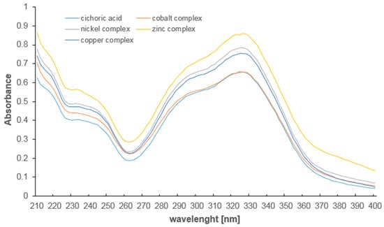 Figure 6. The absorption spectra of cichoric acid and complexes with copper, zinc, cobalt, nickel (210–400 nm, aqua solution 5 × 10−5 mol/dm3).