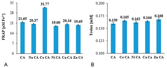 The FRAP values obtained for the studied compounds at the concentration of 6 μM are shown in Figure 7A. The ferric-reducing antioxidant activity of CA and its metal complex did not differ much. The results pointed that cobalt(II) complex with cichoric acid possessed the strongest antioxidant activity measured by the FRAP assay (Co CA: 31.77 μM Fe2+), whereas other studied metal compounds showed slightly lower ferric-reducing activity than cichoric acid. The CUPRAC assay (Figure 7B) revealed slightly higher reducing activity of Cu(II), Zn(II), Ni(II) and Co(II) complexes of cichoric acid than ligand alone.