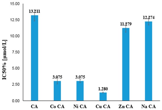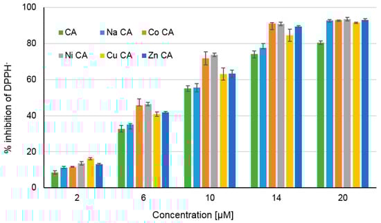 The antiradical activity of tested substances is depicted in Figure 8 as a percentage of DPPH radical inhibition. The degree of inhibition of DPPH by CA and its metal compounds depends on the concentration of tested compounds. With the increase in their concentration (from 2 to 20 μM) the inhibition% increases as well in the range of 8–93%. Moreover sodium salt of CA as well as Co(II), Ni(II), Cu(II) and Zn(II) CAs possess higher antiradical activity than the ligand. In each tested concentrations cobalt and nickel cations caused the highest increase in the antiradical activity of ligand. The calculated EC50 parameters for tested compounds raised in the order: Ni CA (EC50 = 7.10 µM) < Co CA (EC50 = 7.24 µM) < Zn CA (EC50 = 7.70 µM) < Cu CA (EC50 = 7.80 µM) < Na CA (EC50 = 8.95 µM) < CA (EC50 = 9.36 µM). The lower value of the EC50, the higher antiradical activity of the compound.