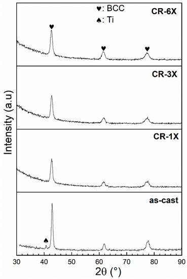 As seen in Table 1, crystallite size did not drastically change upon rolling, whereas the microstrain slightly increased but only for the first rolling. Further rolling did not change the microstrain. The disappearance of the Ti-phase in the CR patterns after rolling occurred because the crystallite size of this phase tended to decrease and the microstrain increased. These two factors caused the peak to broaden. As the Ti phase was already at the limit of detection in the as-cast pattern (the value was 3 ± 3%), as the peaks broadened, they became undistinguishable from the background.