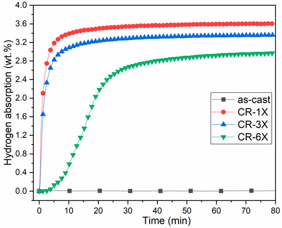 In a previous investigation, we showed that an addition of 12 wt % Zr to Ti1V0.9Cr1.1 alloy produced fast activation kinetics, reaching a maximum capacity of 3 wt % H2 within 3 min [14]. Therefore, adding 12 wt % Zr still produces faster kinetics compared to CR-1X but with reduced capacity. However, using mechanical deformation such as BM and CR does not change the chemistry. Adding other elements may increase the cost of the alloy and change the chemistry of the BCC phase. For these reasons, activation enhancement is better achieved by mechanical than by additive treatment.