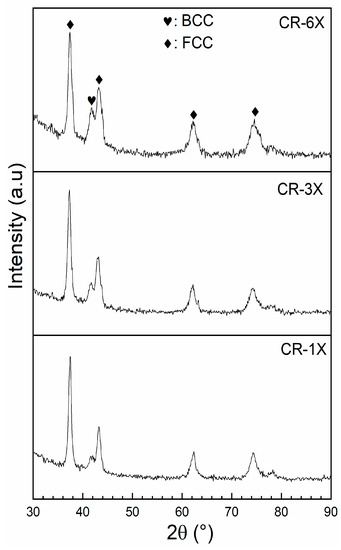 The crystal structure of the full hydride samples was investigated from XRD patterns. Figure 4 presents the XRD patterns of the hydride samples of CR-1X, CR-3X, and CR-6X of Ti1V0.9Cr1.1 alloy.