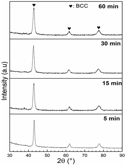 The XRD patterns of Ti1V0.9Cr1.1 alloy for different BM times are presented in Figure 6. The crystal structure parameters and the Rwp, as evaluated by Rietveld’s refinement, are shown in Table 3.