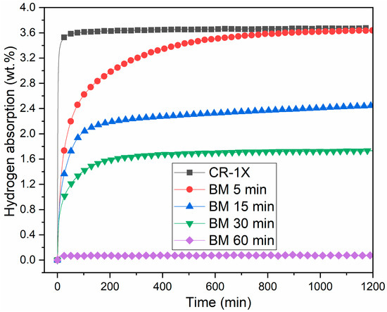 Comparing the result of CR-1X with that of BM-5 min, both are beneficial for activation of the Ti1V0.9Cr1.1 alloy, but CR-1X is more effective since full hydrogenation occurs much faster.