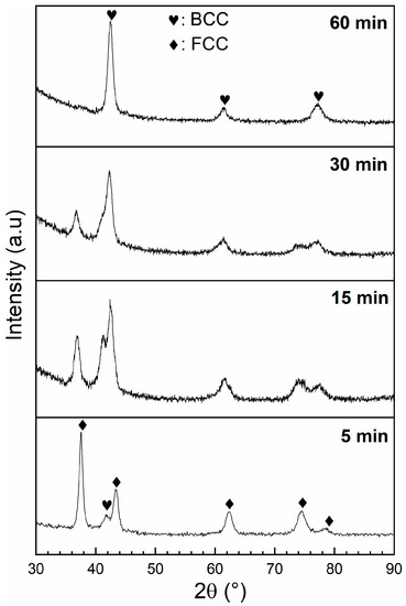 BM was carried out on a Spex 8000 high energy ball mill (SPEX SamplePrep, Metuchen, NJ, USA) in a hardened 55 cc steel crucible and balls with a powder-to-ball mass ratio of 1/10. All loadings and unloading of powder in the crucible were performed in an argon-filled glove box. BM was performed for 5, 15, 30, and 60 min (BM 5min, BM 15min, BM 30min, and BM 60 min, respectively) with a vibration frequency of 1060 cycles per minute. After the milling process, the powders were removed from the crucible in the glove box. The crystal structure was determined by X-ray diffraction (XRD) using a Bruker D8 Focus (Bruker AXS LLC, Madison, WI, USA) with Cu-Kα radiation. Lattice parameters were evaluated from Rietveld refinement using Topas software (V6.0, Bruker AXS LLC, Madison, WI, USA) [35]. Microstructure was investigated using a Hitachi Su1510 scanning electron microscopy (Hitachi High-Tech America, Dallas, TX, USA). First, hydrogenation was performed at room temperature (25 °C) under 20 bars of hydrogen pressure using a homemade Sievert’s apparatus. The samples were filled in the reactor and kept under a dynamic vacuum at room temperature for 1 h before the measurement. After reaching full hydrogenation, the absorption experiment was stopped, keeping the sample under hydrogen pressure. After that, the sample was taken for XRD measurement in the air at room temperature and atmospheric pressure.