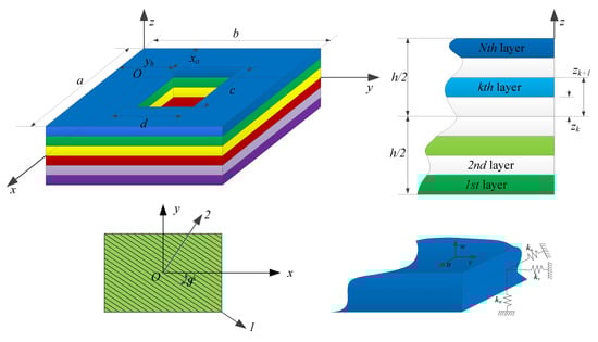 Consider a multilayered laminated composite rectangular plate with a rectangular cutout, as shown in Figure 1. The global coordinate system (x, y, z) which located in the middle surface of the structure is considered to present the dimensions. The length, width, and thickness of the plate are assumed as a, b, and h, the dimensions of the rectangular cutout in the x and y directions are c and d, the distances of the cutout in the x and y directions with respect to the coordinated point O are xa and yb, the coordinates of the cutout center are xh and yh, whereas xh = xa + c/2 and yh = yb + d/2, respectively. The middle surface displacements of the plate in the x, y, and z directions are denoted by u, v, and w, respectively. The number of the layers of the laminated composite plate is assumed to be N, and the kth layer has a thickness of hk, where the hk = zk+1 − zk, and the zk+1 and zk are the distances from the top surface and the bottom surface of the layer to the referenced middle surface. The principal coordinates of the laminated composite plate in the kth layer are denoted as 1, 2, and 3, the angle between the material axis and x coordinate is denoted by . The artificial springs are introduced in order to simulate different kinds of boundary conditions, three groups of springs ku, kv, and kw, which are distributed uniformly along the edges. The stiffness of the springs can take any value from zero to infinity to model the classical boundary conditions or elastic boundary conditions.