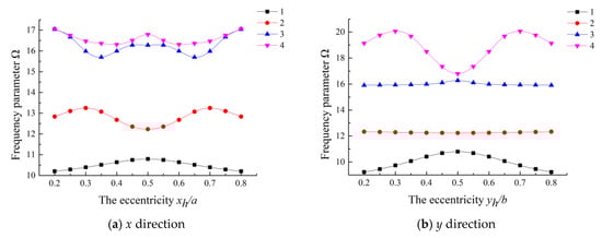 In Figure 2, variation of the lowest four order frequency parameters against the cutout position ratio are shown for the eccentricity in both x and y directions. From Figure 2a, we can see that the frequency firstly increases and then decreases for the first and second order frequency parameters when the eccentricity in the x direction goes from 0.2 to 0.5, while the third and fourth orders have reverse behavior, respectively. From Figure 2b, there is little variation in the second and third orders with the eccentricity ratio varied in the y direction. However, for the fourth order, the frequency parameter has gone through the process of decrease after going up for yh/b in the range of 0.2–0.5. For the first order, the fundamental frequency increases and then declines both in the x direction and y direction, and reaches its wave crest at 0.5. It can conclude that, for a rectangular plate with different aspect ratios, the cutout positions have different effects on the vibration characteristics. Nevertheless, for a square plate with a square cutout, it is conceivable that the frequency parameter variation is consistent in the x direction and y direction.