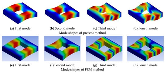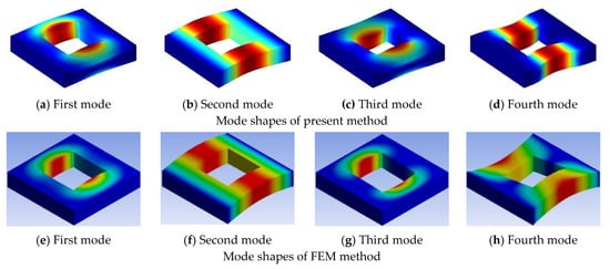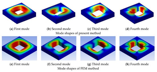Second, in order to verify the reliability of solving the vibration characteristics of a plate with cutouts, a two-layered, cross-ply (0°/90°) laminated square plate with central square cutouts or rectangular cutouts under simply supported boundary condition has been considered, and the first six natural frequency parameters are performed in Table 4. The results of the proposed method are compared with those obtained by Sheikh et al. []. The geometrical dimensions and material properties of the plate are given as follows: m, , ; , GPa, , , , kg/m3. From the table, it can be seen that the difference between the data of the proposed method and Sheikh et al. [] is less than 0.556%, which shows that the present method is able to accurately predict the frequency parameters of a rectangular plate with cutouts. The small differences are related to different laminated plate theory and solution program methods.