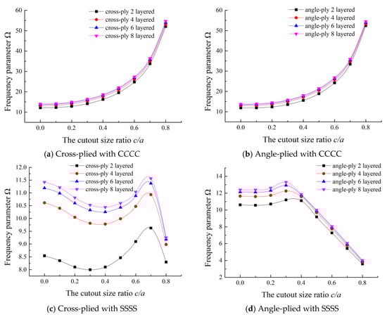 To further study the effect of the number of layers on the frequency characteristic, the fundamental frequency parameters of two-layered, three-layered, four-layered, six-layered, and eight-layered, cross-ply and angle-ply plates with different cutout sizes are presented, the data are given in Table A1. Figure 6 shows the fundamental frequency parameters of cross-ply and angle-ply laminations with even numbers of layers under CCCC and SSSS boundary conditions. From Figure 6, it can be noticed that the frequency parameters increase with the increase of the number of the layers for both cross-ply and angle-ply. From Figure 6a,b, it is obvious that for CCCC boundary condition, the frequency parameters increase with the increase of cutout size ratio, and when the cutout size ratio exceeds 0.6, the frequency parameters increase sharply. However, it is somewhat complicated for SSSS boundary condition. From Figure 6c, for cross-ply lamination, the trend of frequency parameters declines first and then rises, when the cutout size ratio reaches a certain value which is respectively equal to 0.7, the frequency parameter decreases sharply. For angle-ply lamination, there is only a little bit of an upward trend when the cutout size ratio is less than 0.3, while after that, the frequency parameter trend declines with the increase of cutout sizes.