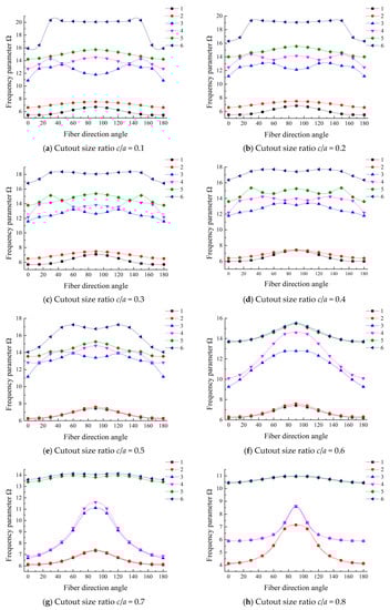 The effect of layer fiber direction angle on the frequency parameters of laminated composite plate with cutouts is studied in the following section. The detailed data are given in Table A2. The first six frequency parameters of a three-layered angle-ply (0°/°/0°) square plate with a center cutout under CFCF boundary condition are investigated, where is the fiber angle in the range of 0°–90°. In Figure 7, the curves of frequency parameters changing with the fiber orientations under various cutout sizes are plotted. The fiber direction angle is varied from 0° to 180° with a step of 15°. All of the curves are symmetric about = 90°, and the trend of frequency parameters is not changing in the same way with the increase of cutout size ratio. The fundamental frequency parameters increase and then decrease with the increase of the cutout size ratio. The trend can be regrouped in three groups according to the performance: Group I, a smaller cutout size ratio, where 0 ≤ c/a ≤ 0.2; Group II, 0.2 < c/a ≤ 0.5; Group III, a larger cutout size ratio, where 0.5 < c/a ≤ 0.8. The trend in each group is generally consistent. It can be observed that the increment of the fiber direction angle from 0° to 90° results in the increase of the lowest two frequency parameters of the plate. For Group III, the frequency parameters climb up with the fiber direction angle changed from 0° to 90°. When the cutout size ratio is small, the trend of the lower-order modal is simpler, but for higher-order modal, the trend is more complex. This is mainly because the bending stiffness plays a dominant role for the lower-order modal, while for the higher-order modal, the bending and shear deformation are coupled with each other, which make the vibration behavior more complex.