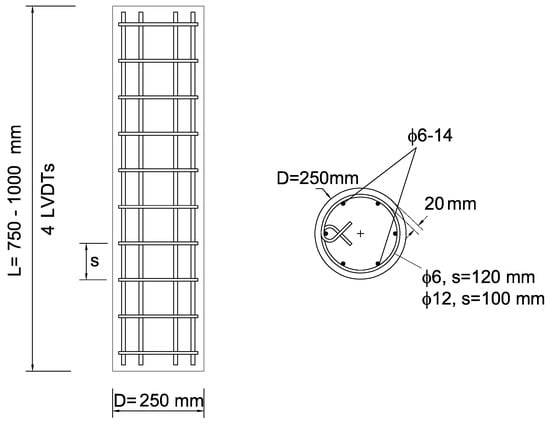 An experimental program was designed and performed to investigate the effectiveness of the AE technique for monitoring the cracking development and the damage levels of HSC columns. The experimental program included four circular reinforced HSC column specimens of  diameter. The test variables are as follows. The height of the columns are  and 1000 mm, and the volumetric transverse reinforcement ratios are  and . These variables were chosen in order to examine their influence on the damage levels and the cracking development monitored by the AE technique in HSC columns subjected to axial compressive loading. The specimens are defined by the TSR hoops bar diameter (6 and 12 mm) and spacing (120 and 100 mm) and by the height of the specimen (S for  mm and L for  mm). Details of the specimens tested at the National Building Research Institute laboratory at the Technion—Israel Institute of Technology are presented in Table 1 and Figure 1.