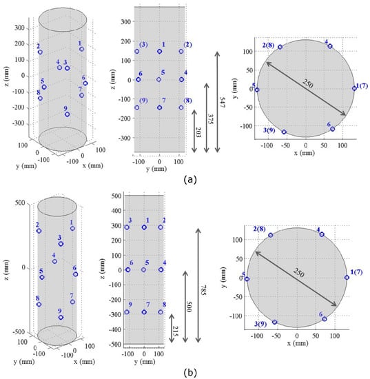 Position of Acoustic Emission (AE) sensors (a) specimens F6S120S and F12S100S, and (b) specimens F6S120L and F12S100L.