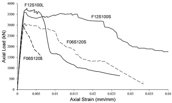 Figure 4 shows the appearance of the columns after testing. Figure 5 show the axial compressive load versus the axial strain (measured from the central LVDT’s) of the tested specimens. Moreover, Table 3 presents the maximum compressive axial load, ; its corresponding strain, ; the post-peak strain at  of the maximum load, ; and the area under the load-strain curves, . The latter two parameters indicate the level of ductility reached by the specimens. It is shown in Figure 5 and Table 3 that, as expected, the overall behavior of specimens F12S100S and F12S100L (with higher amounts of TSR) is better than that of specimens F06S120S and F06S120L in terms of axial load capacity and ductility. It should be noted that the axial strain in Figure 5 is calculated based on the LVDTs gauge lengths equal to  for the shorter specimens (F06S120S and F12S100S) and  for the longer specimens (F06S120L and F12S100L). As the local failure of the specimens with a similar amount of TSR (i.e., F06S120S-F06S120L and F12S100S-F12S100L) was about the same length, different axial strain values can be obtained from the displacements recorded based on LVDTs of different gauge lengths. This fact results in the lower ductility derived for the longer specimens (F06S120L and F12S100L) compared to the shorter ones (F06S120S and F12S100S).